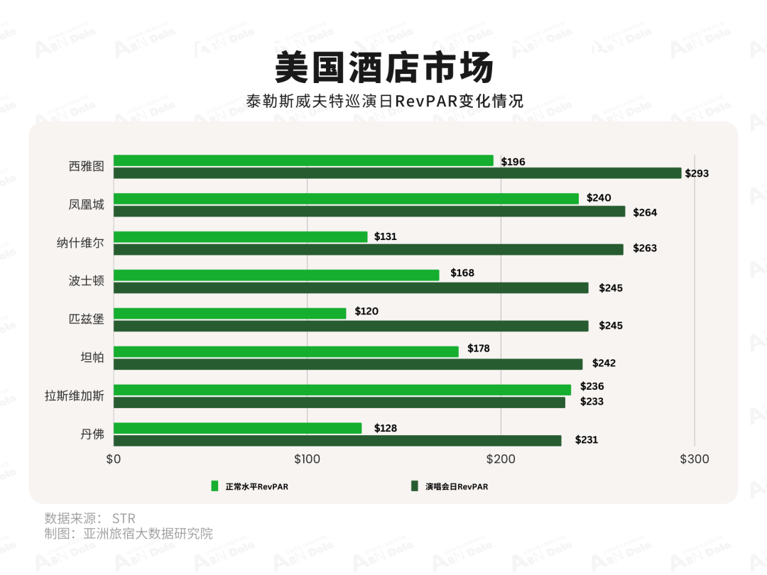 在北美地区,美国酒店市场受演艺经济的推动,各城市活跃度再上台阶。根据STR的数据,泰勒·斯威夫特在20个城市巡演活动将使得美国酒店酒店客房收入额外增收2.08 亿美元,其中西雅图以 RevPAR(293 美元)的成绩领先所有市场,其表现同比MLB 全明星赛期间还高出38%。另外,周末两天的演出还推动整体市场的平均入住率提高了 9.8个百分点,从 80.7%提高到 90.5%。