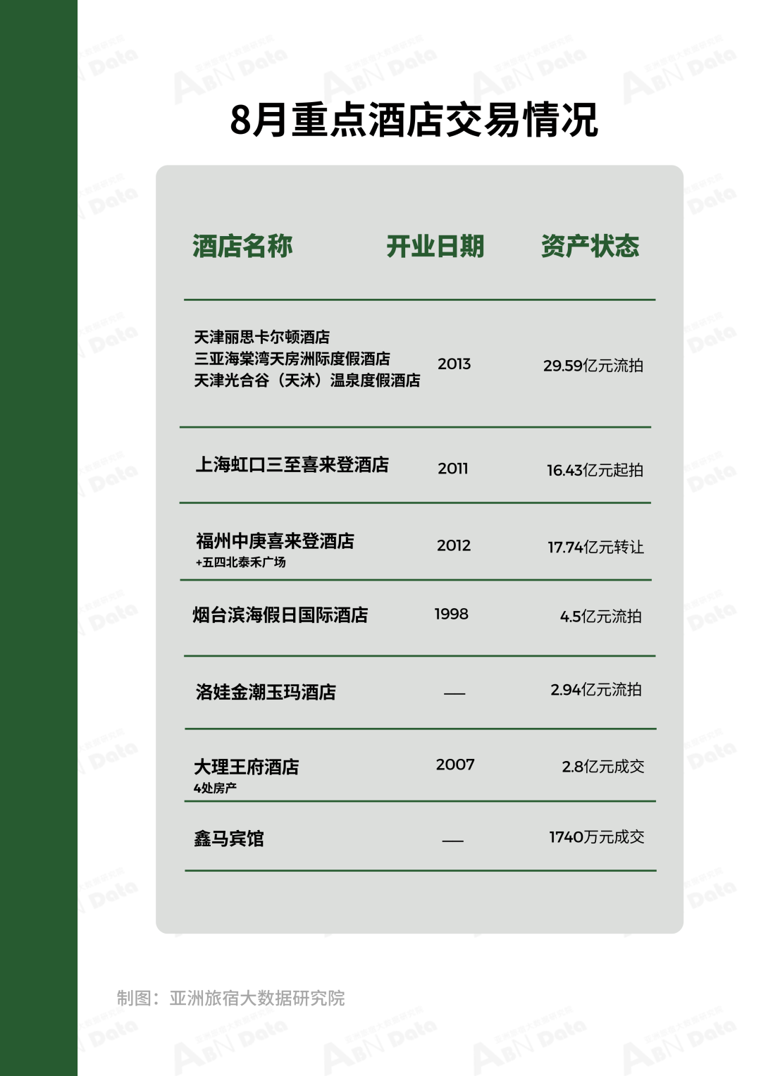 8月,ABN指数监测名录统计共有26家酒店资产处于出售、拍卖及流拍阶段,其中拍卖价格在亿元以上酒店有5家,成交酒店有2家。酒店资产交易典型事件有:天津天房商业抵押拍卖旗下三个五星级酒店,分别为天津丽思卡尔顿酒店、三亚海棠湾天房洲际度假酒店、天津光合谷(天沐)温泉度假酒店;两家老牌喜来登酒店面临资产转让困境,分别为上海虹口三至喜来登酒店大厦和福州中庚喜来登酒店;1998年开业的烟台滨海假日国际酒店在空置9年厚进入拍卖程序,4.5亿余元首拍已流拍。成交酒店为则为大理王府酒店(4处房产)和杭州桐庐县鑫马宾馆。