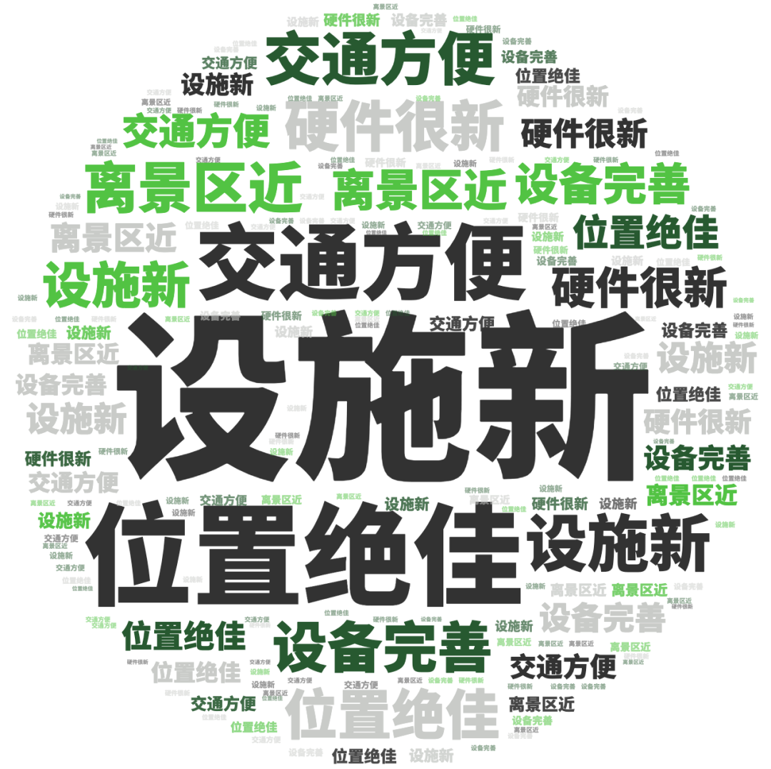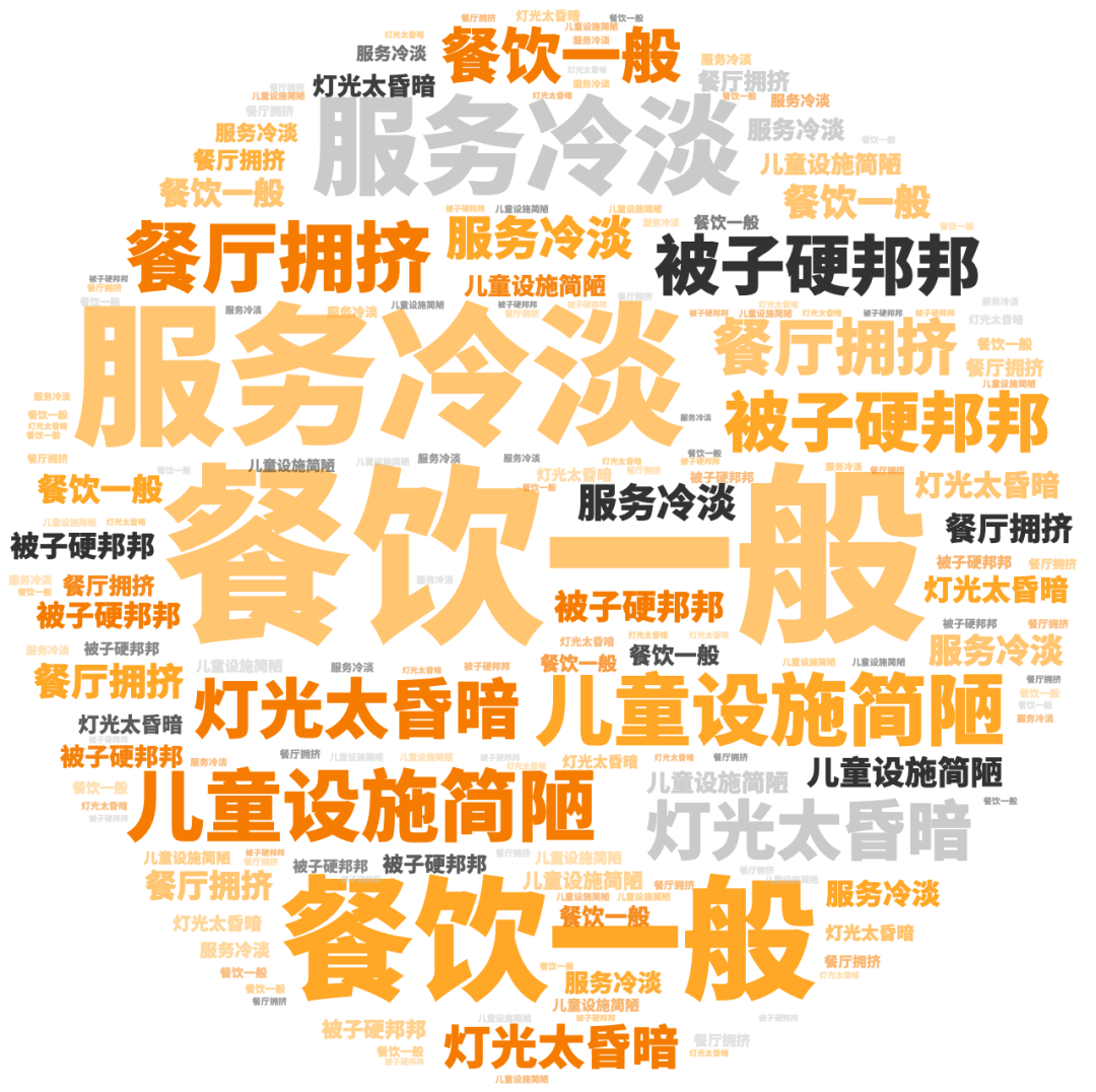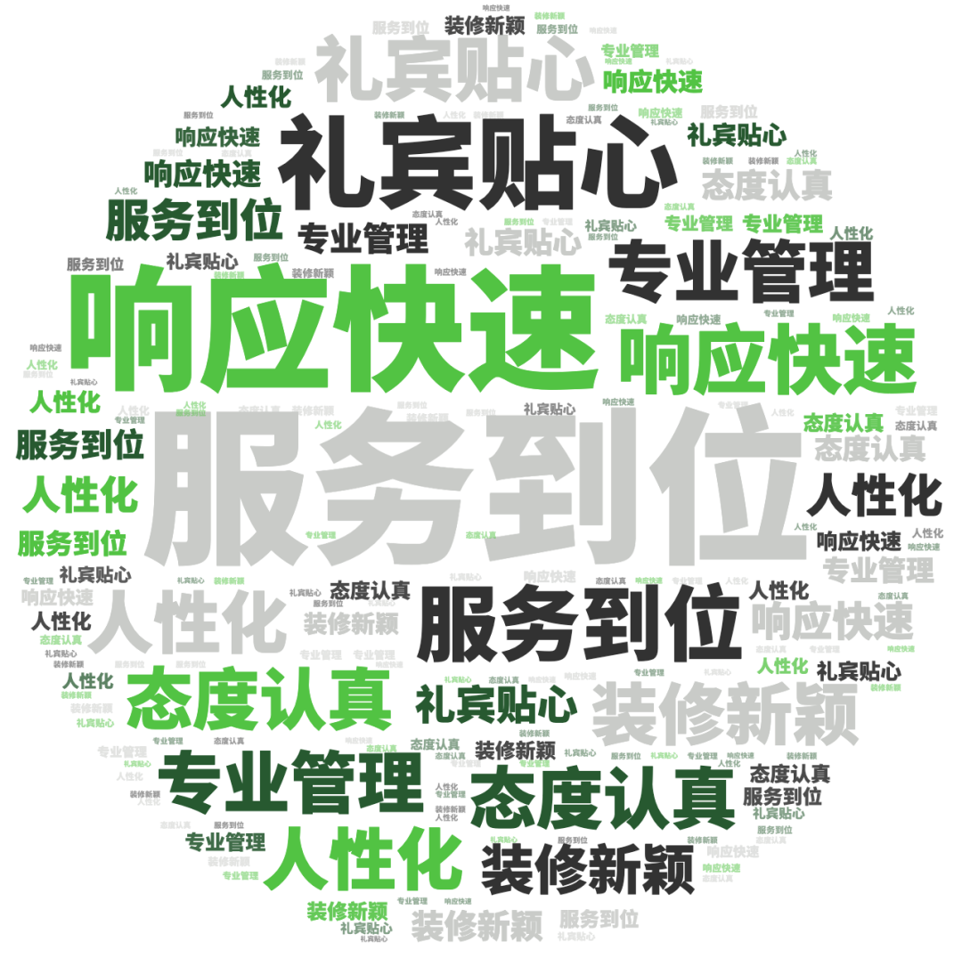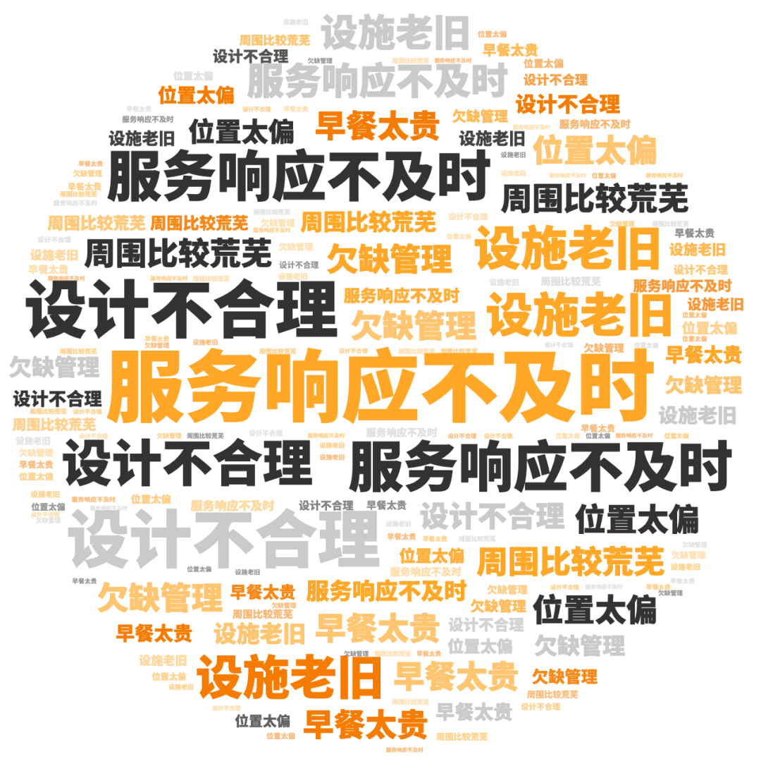 点评指数:点评指数平均得分为81.75,环比出现小幅下跌,本月未有品牌拿到300分,好评维度平均是差评维度的1.1倍。好评关键词主要是服务到位、响应快速、礼宾贴心等,差评主要集中在服务响应不及时、设计不合理、设施老旧等问题。