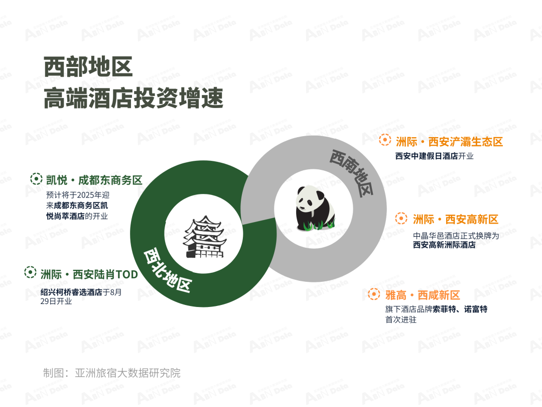 西部高端酒店投资增速|在西南地区,本月重心主要集中在成都酒店市场。一是凯悦酒店集团首次将生活方式品牌凯悦尚萃带入成都,预计将于2025年迎来成都东商务区凯悦尚萃酒店的开业。二是洲际酒店集团旗下高端酒店品牌金普顿西南首店落户成都陆肖TOD,酒店将位于TOD项目超高层塔楼,并配备高空泳池、云端餐厅等功能设施。