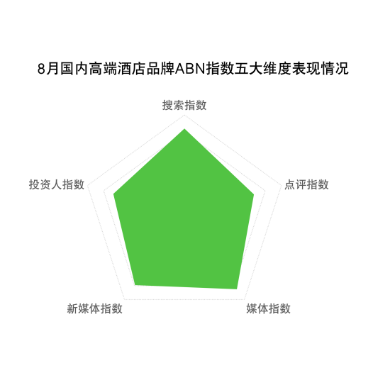 媒体指数:国内高端酒店媒体指数与上月持平,整体得分为94.36,主要得分集中在门户网站、财经媒体、垂直商业网站和国际高端酒店官网的宣传,得分TOP5的品牌分别是君澜度假、丽呈、万达文华、开元名庭、开元名都。