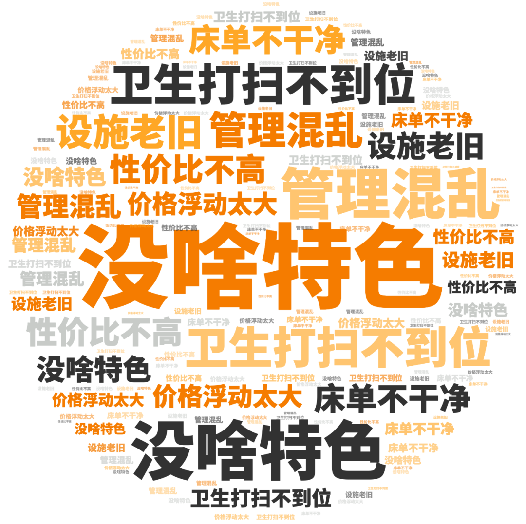 点评指数:经济型酒店点评指数平均得分达88.22分,300分品牌为如家、汉庭、锦江之星、城市便捷,好评维度平均是差评维度的1.1倍。好评关键词主要是经济型酒店的设施新、位置绝佳、交通方便等方面。差评关键词主要集中在价格争议、不隔音、卫生不行等方面。