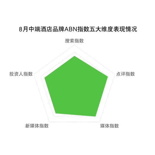 新媒体指数:新媒体指数呈现平稳走向,整体得分为96.78。除了月度开业和签约宣传外,秋季促销、中秋礼遇是中端品牌宣传的热门主题之一,指数TOP5分别为微信、抖音、小红书、微博、B站。