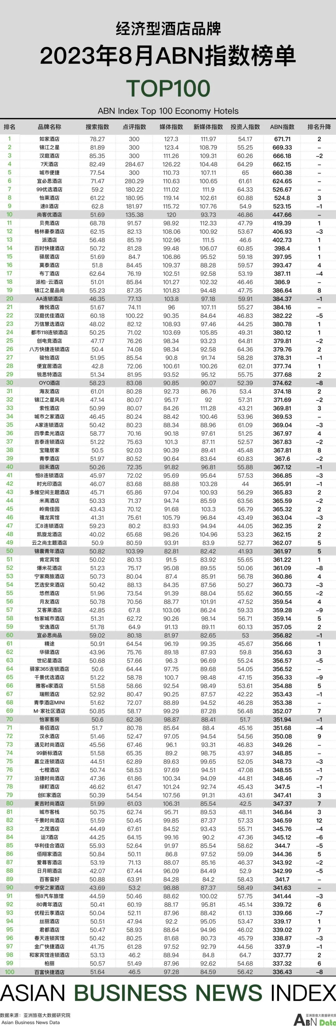 经济型酒店100强榜单