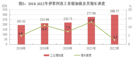 州直建成工业园区11家。其中:国家级5家,自治区级6家。园区年末入驻企业5316个。其中:国家级园区入驻企业4959个,自治区级园区入驻企业357个。全州全年规模以上工业企业实现营业收入1159.02亿元,比上年增长13.7%;亏损企业亏损额29.58亿元,增长33.7%;盈亏相抵实现利润总额138.70亿元,增长26.7%。全年规模以上工业企业每百元营业收入中的成本75.08元;资产负债率64.1%;产品销售率97.6%。州直全年规模以上工业企业实现营业收入762.80亿元,比上年增长19.3%;亏损企业亏损额16.02亿元,增长44.5%;盈亏相抵实现利润总额71.53亿元,增长94.4%。全年规模以上工业企业每百元营业收入中的成本80.07元;资产负债率67.8%;产品销售率98.2%。全州具有资质等级的总承包和专业承包建筑业企业全年实现产值297.10亿元,比上年增长18.0%;建筑企业房屋施工面积1270.42万平方米,增长41.6%;房屋竣工产值128.76亿元,下降17.5%。州直具有资质等级的总承包和专业承包建筑业企业全年实现产值199.99亿元,比上年增长17.6%;建筑企业房屋施工面积959.00万平方米,增长64.1%;房屋竣工产值94.83亿元,下降8.7%。