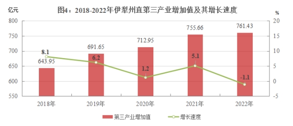 根据地区生产总值统一核算结果,初步核算,伊犁哈萨克自治州全年实现地区生产总值(GDP)2801.36亿元,比上年增长2.9%。其中:第一产业增加值729.53亿元,增长6.2%;第二产业增加值796.31亿元,增长4.8%;第三产业增加值1275.52亿元,增长0.3%。第一产业增加值占地区生产总值比重为26.1%,第二产业增加值比重为28.4%,第三产业增加值比重为45.5%。州直属县市全年实现地区生产总值1524.17亿元,比上年增长2.0%。其中:第一产业增加值307.33亿元,增长6.3%;第二产业增加值455.40亿元,增长5.3%;第三产业增加值761.43亿元,下降1.1%。第一产业增加值占地区生产总值比重为20.1%,第二产业增加值比重为29.9%,第三产业增加值比重为50.0%。