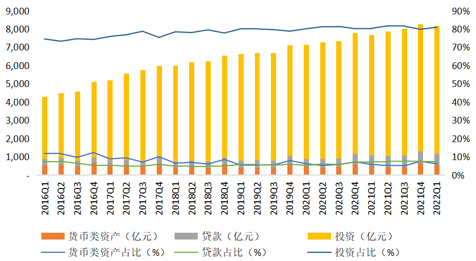 从固有资产的运用方式来看,主要运用方式的规模占比保持了相对稳定。其中,投资仍是固有资产运用最重要的方式,1季度末固有资产投资规模达到7033.12亿元,同比增长6.48%,环比增长0.68%;占比达到80.96%,同比略上升0.57个百分点。货币类资产规模为532.39亿元,同比增长12.02%,环比下降18.36%,占比达到6.13%,同比略上升0.35个百分点。贷款规模为638.08亿元,同比增长7.60%,环比下降0.77%;占比为7.34%,同比略上升0.12个百分点。