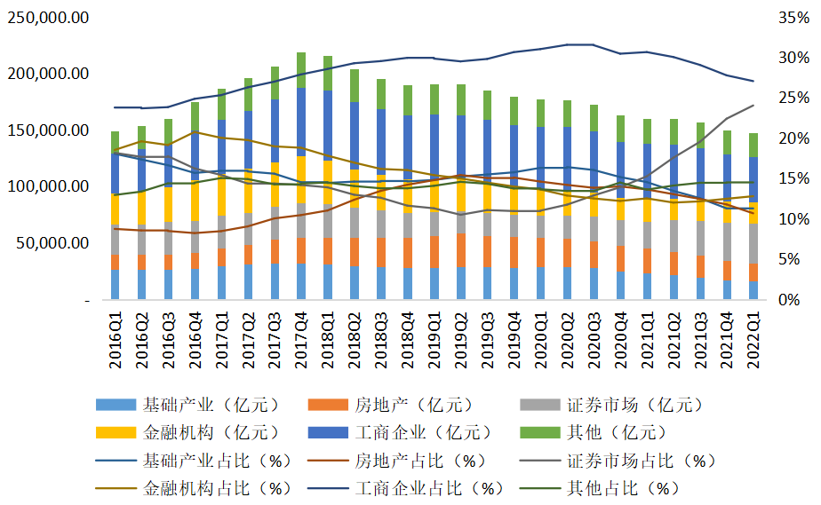 三是资金信托投向结构中,投向证券市场的规模和占比持续提高,而工商企业、基础产业、房地产领域进一步下降。截至1季度末,资金信托规模为14.75万亿元,同比下降7.60%,环比下降1.67%。其中,投向证券市场的资金信托规模为3.54万亿元,同比增长45.72%,环比增长5.51%;占比为24.00%,同比上升8.78个百分点,环比上升1.63个百分点。而投向工商企业的资金信托规模为3.99万亿元,同比下降18.46%,环比下降4.23%,占比下降至27.01%;投向基础产业的资金信托规模为1.65万亿元,同比下降29.00%,环比下降2.50%,占比下降至11.15%;投向房地产的资金信托规模为1.57万亿元,同比下降27.71%,环比下降10.85%,占比进一步下降至10.64%。此外,投向金融机构的资金信托规模为1.88万亿元,同比下降5.59%,环比增长0.83%,占比略升至12.76%;其他投向的信托资产规模为2.13万亿元,同比下降1.72%,环比下降1.95%,占比为14.43%。
