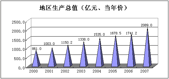 初步核算,全年实现地区生产总值2089.0亿元,按不变价格计算,比上年增长17.7%。其中,第一产业增加值200.0亿元,比上年增长8.6%;第二产业增加值1049.3亿元,增长22.1%;第三产业增加值839.7亿元,增长14.5%。三次产业比重分别为9.6%: 50.2%:40.2%。人均生产总值达到28131元(按户籍年平均人口数计算),比上年增长16.1%。