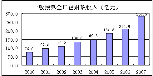 全市一般预算全口径财政收入284.5亿元,增长35.1%。全市地方留用收入93.3亿元,增长30.3% ;地方财政支出181.6亿元,增长23.8%。全口径财政收入占GDP的比重为13.6%,比上年提高1.5个百分点。