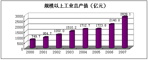 2007年完成全口径工业增加值846.8亿元。完成规模以上工业总产值2839.1亿元,比上年增长33.9%。