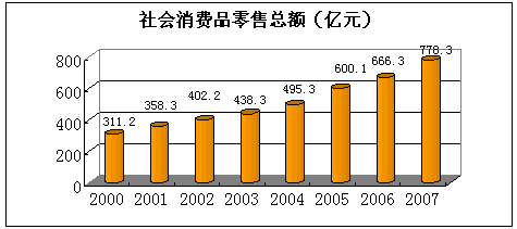 全年实现社会消费品零售总额778.3亿元,比上年增长16.8%。分行业看,批发零售贸易业零售额697.9亿元,比上年增长18.1%。其中:限额以上批发零售贸易业零售额309.5亿元,比上年增长34.3%,限额以下及个体零售额388.4亿元,比上年增长7.7%。住宿和餐饮业零售额80.1亿元,比上年增长6.9%。其中:星级(限额以上)企业零售额11.4亿元,比上年下降29.2%,星级以下(限额以下)企业及个体户零售额68.7亿元,比上年增长16.8%。