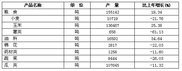 全年农作物播种面积31380公顷,比上年增播968公顷。其中:粮食、油料、蔬菜和药材类作物种植面积扩大,棉花、瓜类和其他作物种植面积减少,粮食作物、经济作物和其他农作物种植结构由上年的6.2:3.9:1调整为14.6:8.6:1。随着播种面积增加和单产的提高,产量增大。全年粮食总产量155142吨,比上年增产25142吨,增长19.34%。其中:玉米产量增长25.38%。油料产量16592吨,增产4269吨,增长34.64%,棉花产量2817吨,减产796吨,蔬菜产量8444吨,减产2972吨,瓜类产量107645吨,减产13745吨,分别下降22.03%、26.03%和11.32%。