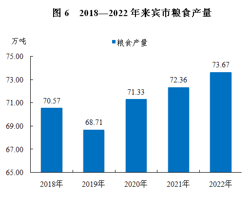 全年粮食产量73.67万吨,比上年增加1.31万吨,增长1.8%,其中稻谷产量55.73万吨,增长1.8%;玉米产量14.38万吨,减少1.7%。