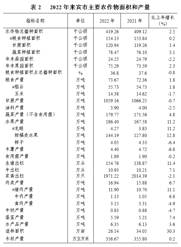 全年粮食种植面积154.13千公顷,比上年增加0.28千公顷;甘蔗种植面积120.94千公顷,增加1.68千公顷;油料种植面积15.07千公顷,减少2.63千公顷;蔬菜种植面积78.47千公顷,增加2.37千公顷;果园面积75.29千公顷,增加1.70千公顷;木薯种植面积4.29千公顷,减少1.13千公顷;桑园面积24.25千公顷,减少0.54千公顷。