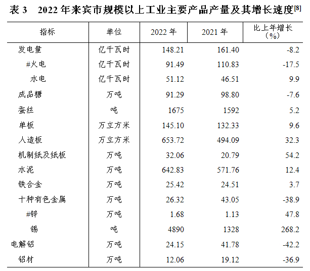 全年规模以上工业中,造纸和纸制品业增加值增长49.7%;木材加工和木、竹、藤、棕、草制品业增加值增长29.9%;黑色金属冶炼和压延加工业增加值增长6.7%;农副食品加工业增加值下降1.0%,其中制糖业下降0.9%;电力、热力生产和供应业下降6.4%,其中电力生产业下降6.5%,电力供应业下降6.9%;有色金属冶炼和压延加工业下降23.5%。