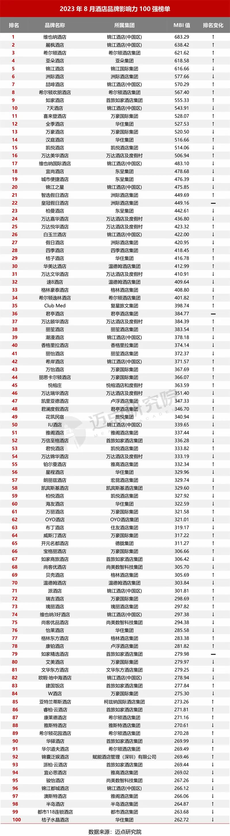 “2023年8月酒店品牌影响力(MBI)100强榜单”数据来源于迈点品牌指数MBI,根据8月迈点MBI八大旅游住宿业品牌类目中的1904个品牌数据汇总统计而成。具体说明如下:迈点酒店品牌指数(MBI)主要从搜索指数、点评指数、运营指数、媒体指数4个维度分析品牌在互联网和移动互联网的影响力。迈点研究院自主开发的“迈点品牌指数监测系统” Meadin Brand Index Monitoring System(MBIMS)提供的一项免费数据分析服务。计算公式:MBI=a*SI+b*CI+c*OI+d*MI(1)搜索指数(SI):一段时期内,品牌关键词在主流搜索引擎中正面搜索频次的加权和。(2)点评指数(CI):一段时期内,用户对于该品牌下酒店/客栈/民宿在OTA网站的点评累计情况。(3)运营指数(OI):一段时期内,品牌在互联网和移动互联网运营情况,如微博、微信等。(4)媒体指数(MI):一段时期内,大众媒体和行业媒体报道中与品牌关键词相关的正面新闻数量。2.统计时间:2023年8月1日-2023年8月31日3.监测范围:奢华酒店、国际高端酒店、国内高端酒店、中高端酒店、中端酒店、轻中端酒店、经济型酒店、精品民宿等八大类目的1904个市场主流旅游住宿业品牌。基于百人团队的全时监测、超千种维度的数据抓取、5轮层层精校与自我审核,迈点品牌指数MBI最终得以化繁为简,将繁杂的数据表象精炼为客观指数并加以呈现。历经11年有余的数据积淀与深耕,迈点品牌指数MBI也日益成为洞察行业品牌发展变化的风向标。