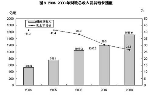 财政:全年全省财政总收入1518.02亿元,比上年增长26.5%。一般预算收入747.88亿元,增长25.1%。其中,税收收入566.43亿元,增长31.7%,国内增值税、营业税、企业所得税、个人所得税、资源税和城建税共计完成税收514.45亿元,分别增长34.9%、36.5%、3.7%、23.7%、22.6%和44.0%。