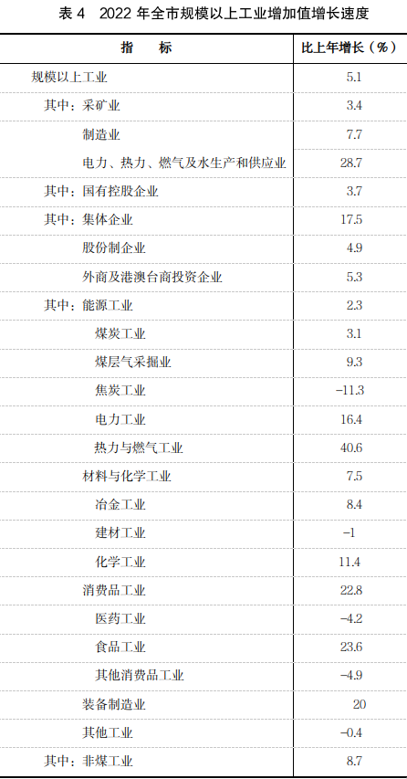 从主导行业看,煤炭工业增长3.1%;焦炭工业下降11.3%;化学工业增长11.4%;食品工业增长23.6%(其中,酒的制造增长24.8%);冶金工业增长8.4%;电力工业增长16.4%;热力与燃气工业增长40.6%。