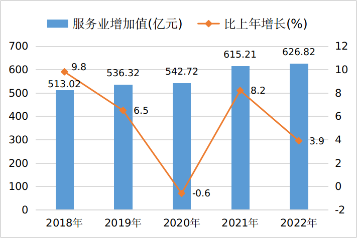 全年全市服务业增加值626.82亿元,按不变价格计算,比上年增长3.9%。其中,批发和零售业增加值101.28亿元,下降0.1%;交通运输、仓储和邮政业增加值79.82亿元,下降3.2%;住宿和餐饮业增加值14.81亿元,下降4.6%;金融业增加值85.14亿元,增长10%;房地产业增加值66.19亿元,增长1.7%。