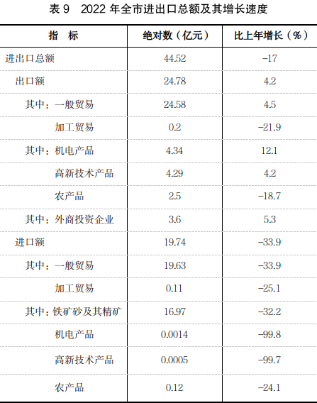 全年全市进出口总额44.52亿元,比上年下降17%。其中,进口额19.74亿元,下降33.9%;出口额24.78亿元,增长4.2%。