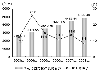 固定资产投资结构继续优化。全年完成全社会固定资产投资总额4829.46亿元,比上年增长8.3%(见图2)。其中,城市基础设施投资1733.18亿元,增长18.2%。从产业投向看,第一产业投资8.4亿元,比上年增长0.4%,占全社会固定资产投资总额的比重为0.2%;第二产业投资1420.82亿元,增长1.7%,所占比重为29.4%;第三产业投资3400.24亿元,增长11.4%,所占比重为70.4%。从投资主体看,国有经济投资2295.75亿元,比上年增长29%,占全社会固定资产投资总额的比重为47.5%;集体经济投资104.86亿元,下降13.7%,所占比重为2.2%;股份制经济投资1026.67亿元,下降12.2%,所占比重为21.3%;外商及港澳台投资748.13亿元,增长5.2%,所占比重为15.5%。