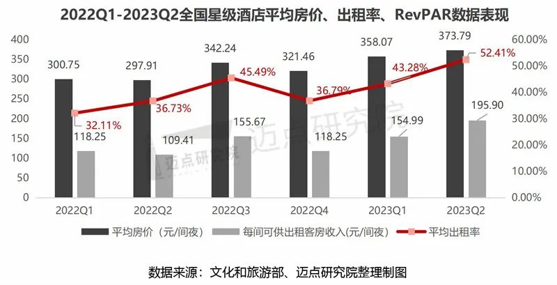 2023年第二季度,全国星级酒店平均房价373.79元/间夜,同比增长25.54%;平均出租率52.41%,同比增长42.85%;每间可供出租客房收入195.90元/间夜,同比增长79.34%。从各项经营指标的变动分析,2023年全国星级酒店的平均房价、平均出租率、酒店RevPAR三项指标均呈递增且二季度为自2022年以来单季度最高,星级酒店整体经营情况明显改善。