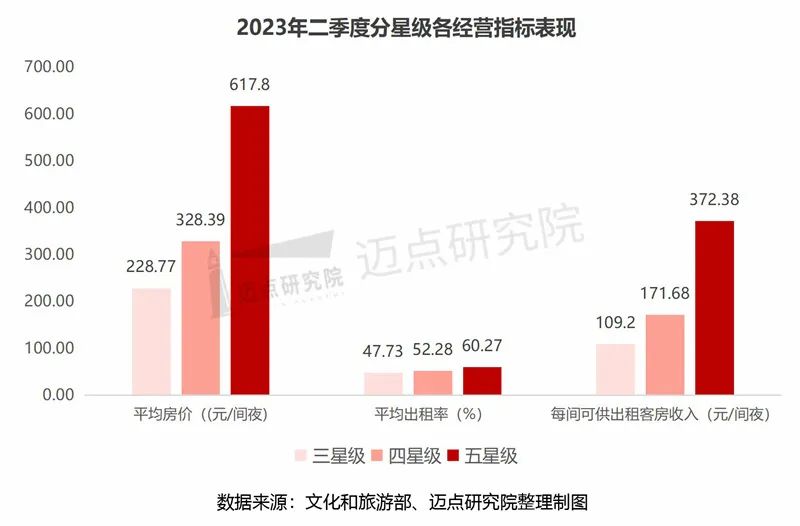 2023年二季度,从三星、四星、五星各星级经营情况分析:全国三星级酒店平均房价228.77元/间夜,环比增长6%;平均出租率47.73%,环比增长22%;每间可供出租房收入109.2元/间夜,环比增长29%。全国四星级酒店平均房价328.39元/间夜,环比增长4%;平均出租率52.28%,环比增长25%;每间可供出租房收入171.68元/间夜,环比增长30%。全国五星级酒店平均房价617.8元/ 间夜,环比增长7%;平均出租率60.27%,环比增长17%;每间可供出租房收入372.38元/间夜,环比增长25%。