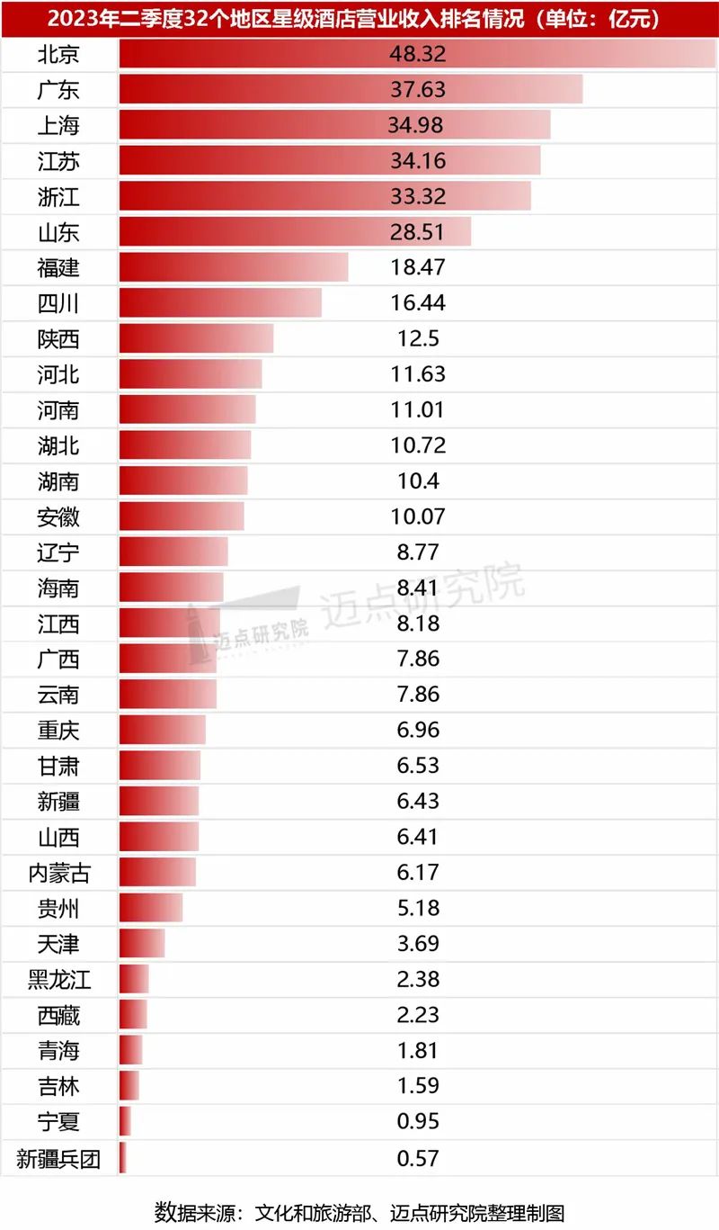 二季度,星级酒店营业收入超20亿元的地区包括北京、广东、上海、浙江、山东5个地区,其中北京市以48.32亿元位列第一;而宁夏、新疆兵团两个地区星级酒店营业收入不足1亿元。进一步从营收结构分析,餐饮营收比重超过全国平均水平(38.85%)的共16个,占据一半,且“内蒙古、河北、山西”华北三省区的餐饮营收占比位列前三;而客房营收比重超过全国平均水平(46.60%)的地区共21个,且排名前六的地区中有四个均来自于西北,具体为西藏、新疆兵团、青海、新疆,反映了二季度西北地区的旅游市场火热带动酒店客房入住率的攀升。