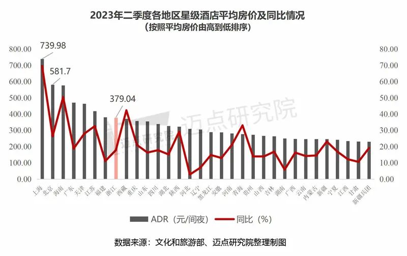 2.平均房价:上海市以739.98元/间夜的高位水平领衔,同比增幅约达70%二季度,32个地区中星级酒店平均房价高于全国平均水平373.79元/间夜的共计8个,从高到低依次为上海、北京、海南、广东、天津、江苏、福建、浙江,与一季度相比“入围地区”未变,相互间的位次稍有变动。值得关注的是,上海市是唯一超700元/间夜的地区,比第二名的北京高出158.28元。同比维度,32个地区均为正增长,且上海市的增幅最大,同比增长69.62%(解读说明:2022年同期上海市因受疫情影响,文旅住宿行业处于“低谷”,基数较低)。