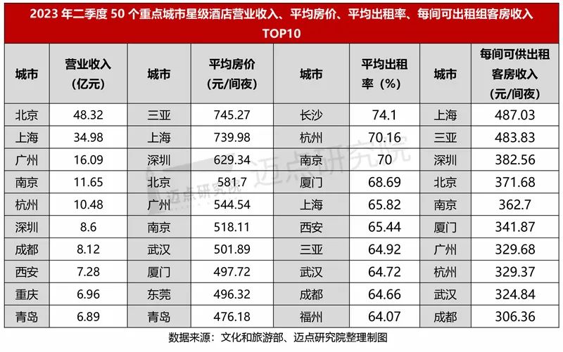 营收情况:合计营收266.55亿元,约占二季度全国星级酒店营业收入的65%。北京市营收48.32亿元,位居50个城市首位。营收超10亿元的城市除北京外,还包括上海、广州、南京和杭州4个城市,即均为一线、新一线城市。同一季度相比,“北上广”和南京稳居前四,且各城市的营收均有所增长。平均房价:全国重点旅游城市平均房价475.51元/间夜,环比增长约8%。三亚、上海星级酒店平均房价超700元/间夜,分别为745.27元/间夜、739.98元/间夜,名列前茅。超全国平均水平的城市共10个,除三亚、上海之外,依次为深圳、北京、广州、南京、武汉、厦门、东莞和青岛。同一季度相比,三亚、上海和深圳3个城市的稳居前三,但三亚市的平均房价环比下滑21%。主要因为,二季度,伴随全国各地文旅消费复苏加快,三亚的领先优势减弱,其他旅游城市的客流分流现象明显。平均出租率:全国重点旅游城市平均出租率58.96%,环比上升11.37个百分点。50城中长沙、杭州、南京三个城市星级酒店平均出租率达到或超70%,彰显了热门旅游城市强大的客流吸引力,酒店客情状况优异。如以南京为例,上半年,南京凭“颜值”和“气质”在全国迅速“圈粉”,演出和旅游市场火爆,会展旅游也强势复苏,全市酒店住宿市场呈现量价齐升的火热态势。据南京市文旅局数据显示,市区高星级酒店平均出租率和价格均超过2019年同期,创下历史新高。每间可供出租房客房收入:全国重点旅游城市每间可供出租客房收入280.35元/间夜,环比增长33%。上海市和三亚市星级酒店RevPAR分别以487.03元/间夜、483.83元/间夜位居第一、第二,其酒店客房产生的平均实际营业收入水平相对较高。其次是深圳、北京和南京,二季度其星级酒店RevPAR均超350元/间夜。此外,与一季度相比,三亚市星级酒店RevPAR下降36%,下滑较为严重,源于该季度平均出租率和平均房价的“双下降”,可见随着全国各地文旅复苏进程的加快,各城市之间的游客流量的抢夺愈加激烈,因而酒店行业更应该重视增加优质产品与服务供给、强化多渠道营销和流量转化等“功课”。小结:二季度,全国50个重点城市星级酒店合计营收环比增加55.47亿元,平均房价、平均出租率、每间可供出租房客房收入整体均实现环比上升。同时,从各经营指标排名前十的数据比较可知,相比一季度三亚的“独领风骚”和“差异显著”,二季度各城市星级酒店经营指标趋向“整体上升”与“均衡发展”,酒店行业的整体复苏程度加快加深。