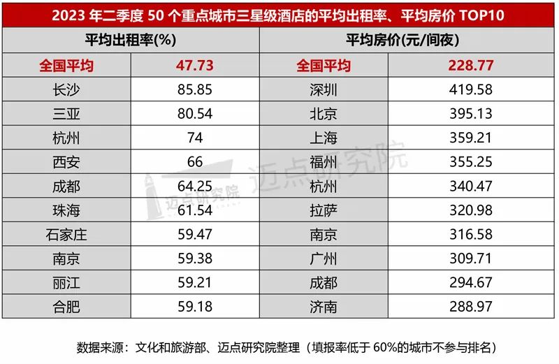 从不同星级看,50个重点旅游城市三星及以上星级酒店平均出租率、平均房价表现如下:三星级:二季度,全国三星级酒店平均出租率47.73%,环比提升8.67个百分点。超过全国三星级平均水平的城市共计32个,长沙市以85.85%的绝对优势名列第一,三亚市紧随其后,其平均出租率80.54%;全国三星级酒店平均房价228.77元/间夜,超过全国水平的城市共计33个,“深、北、上”位列前三。