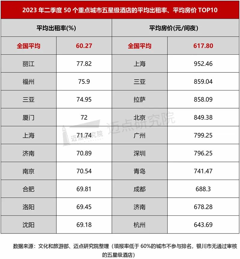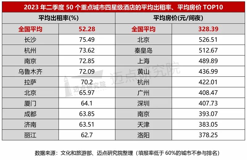 四星级:二季度,全国四星级酒店平均出租率52.28%,环比增加2.89个百分点,超过全国平均水平的城市共29个,依然是长沙市占据首位,具体为75.49%,杭州、南京、乌鲁木齐、拉萨这4个城市四星级酒店平均出租率均超70%;全国四星级酒店平均房价328.39元/间夜,比一季度增加13.86元/间夜,超过平均水平的城市共有23个,北京市以526.51元/间夜排名第一。