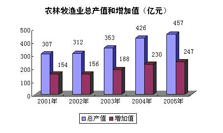 国家各项惠农政策的实施,促进了农业生产的稳定发展。2005年全市农林牧渔业总产值457亿元,比上年增长5.4%,其中农业产值204亿元,增长4.5%,牧业产值231亿元,增长5.9%,农林牧渔服务业产值13亿元,增长10.3%。粮食生产再创历史最好水平,全年粮食总产量和亩产分别达到482.4万吨和439公斤,分别比上年增加了12.6万吨和6公斤。