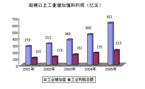 2005年全市工业保持了上年较快增长的态势,并获得效益与生产基本同步增长的好局面。全市规模以上工业企业完成增加值620.7亿元,比上年增长22.9%,增速比上年略有回落,其中国有控股工业完成增加值213.3亿元,增长9.6%。工业产销衔接良好,经济效益稳步增长,亏损额减少,全市工业产销率达98.0%,全市规模以上工业实现利税212.6亿元,增长21.3%,比上年加快2个百分点,亏损企业亏损额下降18.0%。 “药都”建设取得新成绩,成为国家3个生物产业基地之一。