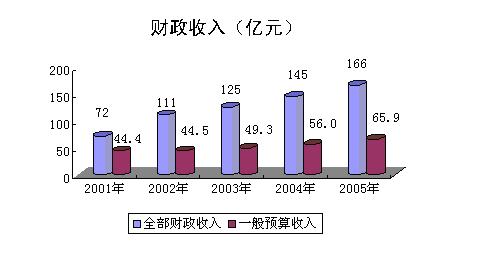 在经济健康发展的基础上加强税收征管力度,财政保持持续稳定增长。全部财政收入完成165.6亿元,增长13.7%,其中一般预算收入完成65.9亿元,增长13.8%。在全部税收中,增值税完成68.1亿元,增长14.8%;营业税完成24.0亿元,增长16.4%;企业所得税完成21.3亿元,增长10.5%;个人所得税完成14.7亿元,增长15.5%。全市一般预算支出106.9亿元,增长14.9%,其中企业挖潜改造资金支出2.6亿元,增长30.1%;科技三项费用支出1.7亿元,增长23.2%;城市维护费支出6.3亿元,增长22.4%;抚恤和社会福利救济费支出4.2亿元,增长23.2%。全市向低保人员和下岗职工发放补助和生活费1.8亿元,向企业离退休人员发放养老金16.4亿元,保障了特殊社会群体的资金需要,维护了社会的和谐、稳定发展。