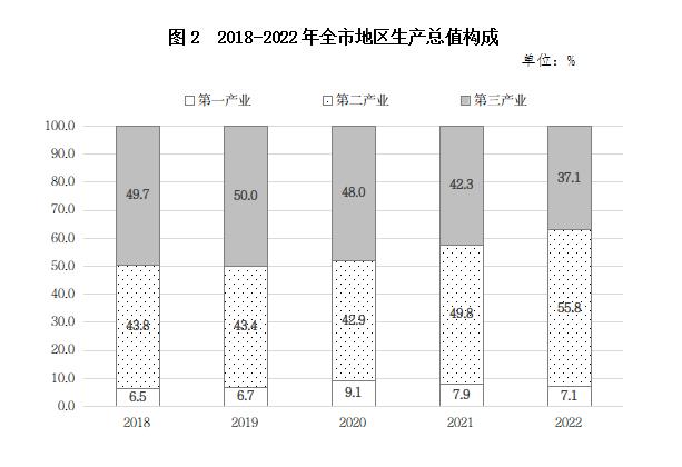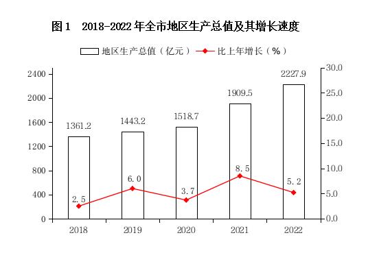 初步核算,全年全市地区生产总值2227.9亿元,按不变价格计算,比上年增长5.2%。其中,第一产业增加值158.0亿元,比上年增长5.2%,占生产总值的比重为7.1%;第二产业增加值1243.0亿元,增长7.0%,占生产总值的比重为55.8%;第三产业增加值826.8亿元,增长3.4%,占生产总值的比重为37.1%。