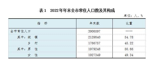 年末全市常住人口390.66万人,比上年末减少0.58万人。其中,城镇常住人口213.98万人,占常住人口比重为54.78%,比上年末提高0.63个百分点。全年全市出生人口2.48万人,出生率为6.35‰;死亡人口3.14万人,死亡率为8.02‰;自然增长率为-1.67‰。