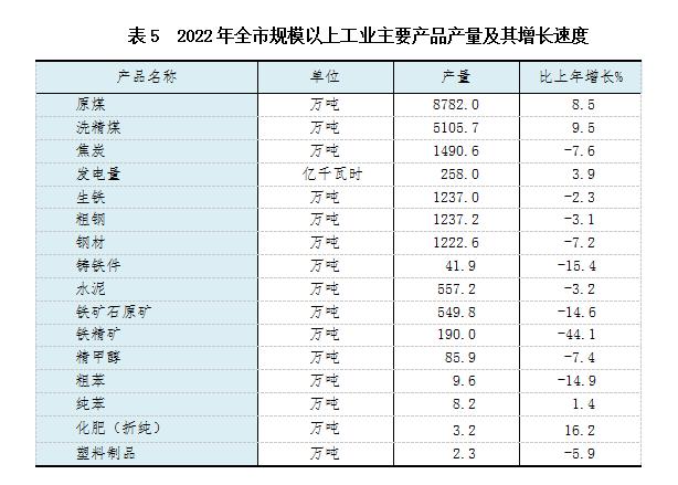 全年全市规模以上原煤产量8782.0万吨,比上年增长8.5%;焦炭产量1490.6万吨,下降7.6%;发电量258.0亿千瓦时,增长3.9%;非常规天然气产量18.5亿立方米,下降1.0%。