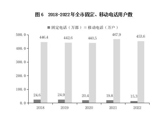 全年全市完成邮电业务总量42.4亿元,比上年下降2.8%,其中,邮政业务总量4.5亿元,增长2.6%;电信业务总量37.9亿元,下降3.4%。年末全市固定电话15.3万部,比上年下降22.7%,移动电话453.6万户,下降3.1%,移动电话普及率115.9部/百人。年末4G基站总数16243个,比上年增长0.9%;5G基站总数6533个,增长99.5%。全市宽带接入用户155.1万户,比上年增长10.8%。