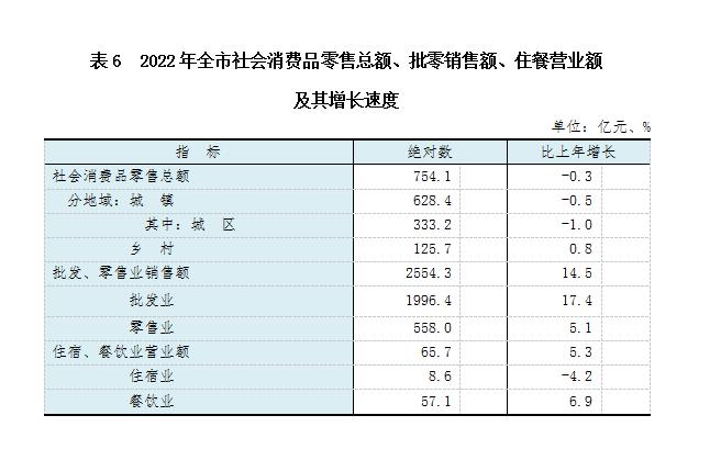 全年全市社会消费品零售总额754.1亿元,比上年下降0.3%。按经营地统计,城镇消费品零售额628.4亿元,下降0.5%;乡村消费品零售额125.7亿元,增长0.8%。按消费形态统计,商品零售额676.6亿元,下降0.6 %;餐饮收入额77.5亿元,增长2.1%。