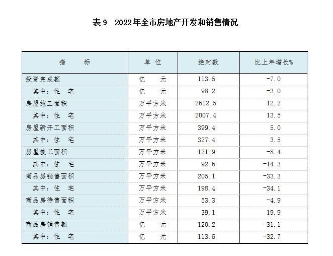 全年全市房地产开发投资113.5亿元,比上年下降7.0%。其中,住宅投资98.2亿元,下降3.0%;商业营业用房投资5.0亿元,下降56.3%。
