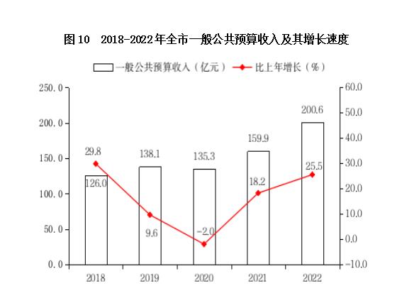 全年全市一般公共预算收入200.6亿元,比上年增长25.5%。其中,税收收入162.1亿元,增长39.7%,占一般公共预算收入的比重80.8%。全年新增减税降费及退税缓税缓费39.3亿元。