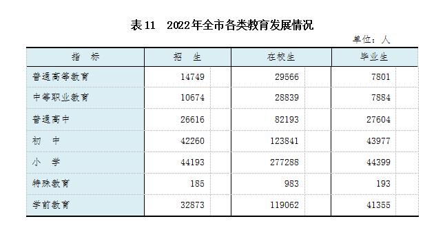年末全市高等院校4所。全年新(改、扩)建公办幼儿园10所,认定普惠性民办幼儿园34所,学前教育毛入园率达到98.3%。