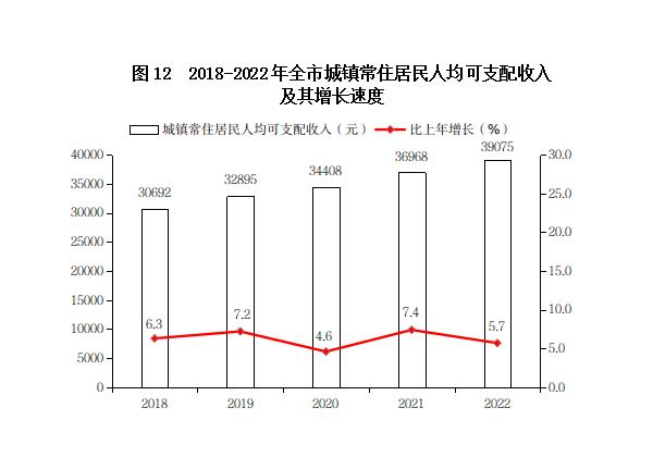 全年全市居民人均可支配收入27375元,比上年增长6.5%。其中,城镇常住居民人均可支配收入39075元,增长5.7%;农村常住居民人均可支配收入16334元,增长6.8%。居民人均消费支出14042元,比上年增长1.6%。其中,城镇居民人均消费支出17783元,下降0.9%;农村居民人均消费支出11994元,增长6.2%。
