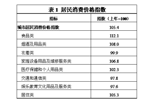 价格上涨得到有效控制。全年城市居民消费价格总水平比上年上涨5.4%,涨幅逐季回落。八大类分类价格指数呈现“五升三降”格局(见表1)。其中,食品类价格上涨12.1%,涨幅比上年扩大0.5个百分点,影响价格总水平上涨4个百分点,仍是拉动价格总水平上涨的主要因素。