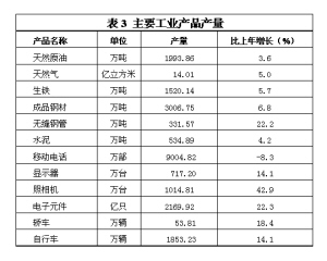 产销衔接继续保持较高水平。全市规模以上工业企业产销率达到98.80%,其中,重工业产销率98.73%,轻工业产销率99.12%。主要产品产量如下(见表3)。