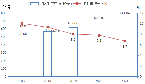 经济增长:2021年,全市实现地区生产总值(GDP)741.84亿元,比上年增长6.7%。其中:第一产业增加值24.45亿元,增长4.7%;第二产业增加值278.08亿元,增长1.0%;第三产业增加值439.31亿元,增长10.8%。