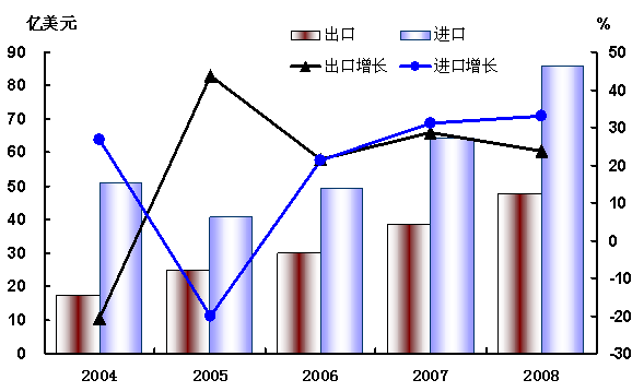 图6:2004—2008年进出口总额及其增长速度