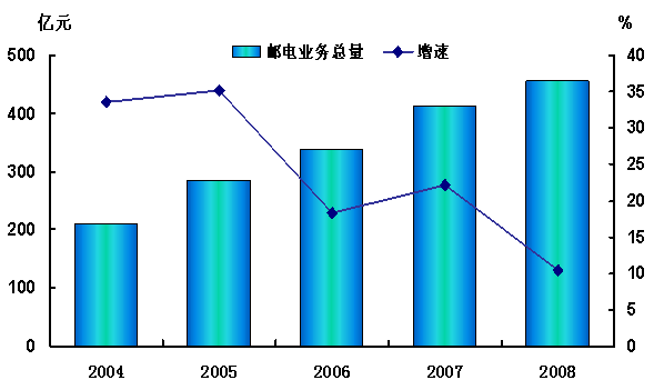 图7:2004—2008年邮电业务总量及其增长速度